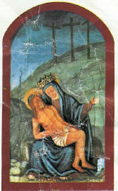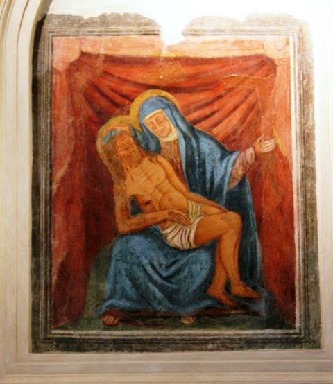 Sulla parete di fondo, il dipinto della Madonna che regge il corpo di Cristo morto.