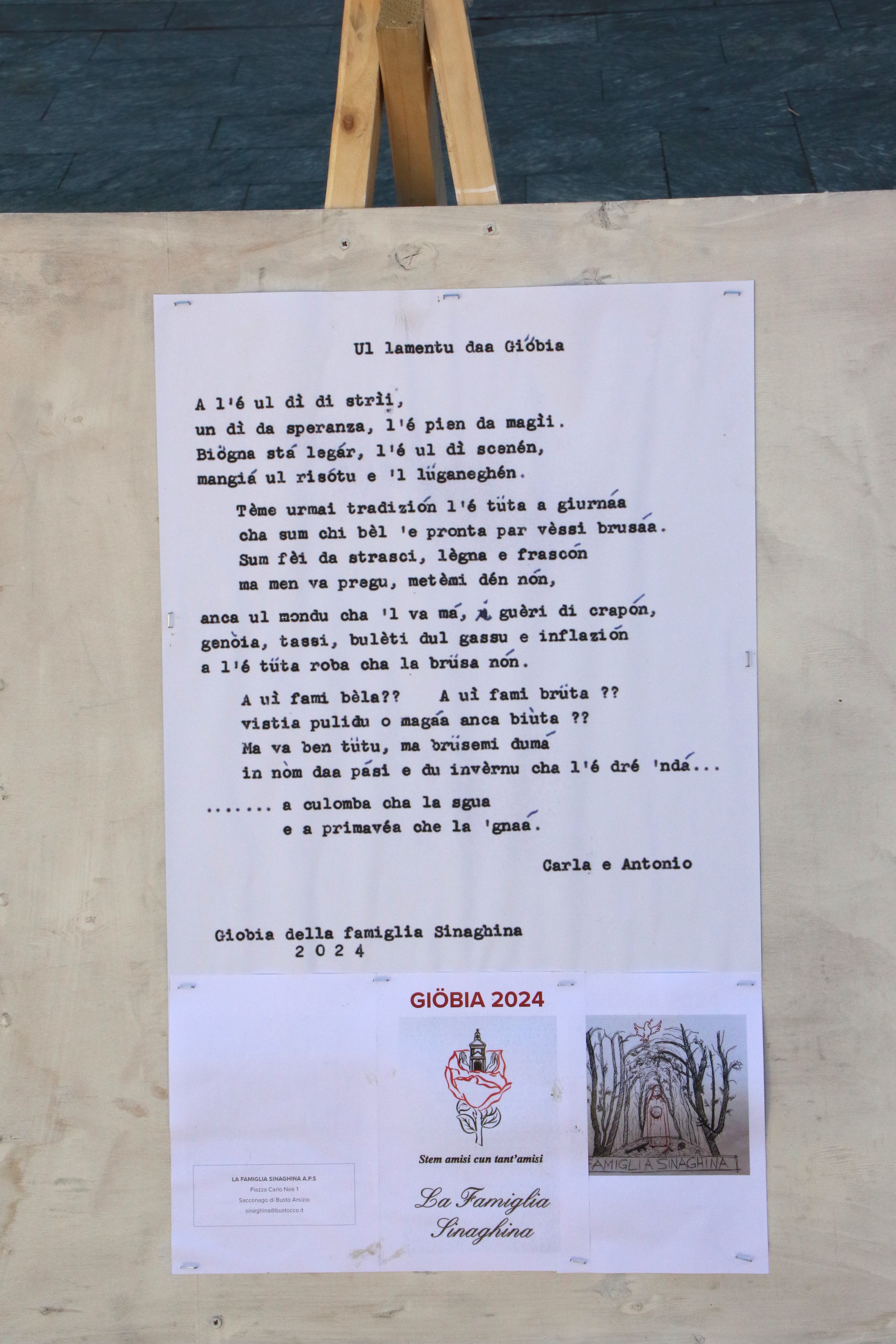 25 gennaio 2024. La manifestazione del 2024 vede numerosissime iniziative in tutti i quartieri cittadini. Nonostante le restrizioni imposte dalla amministrazione, fra cui alcune davvero poco comprensibili come il divieti di utilizzare bancali per la pira, la tradizione millenaria è più viva che mai. Si torna dunque ad esporre e bruciare le Giöbie nelle piazze e nei cortili.