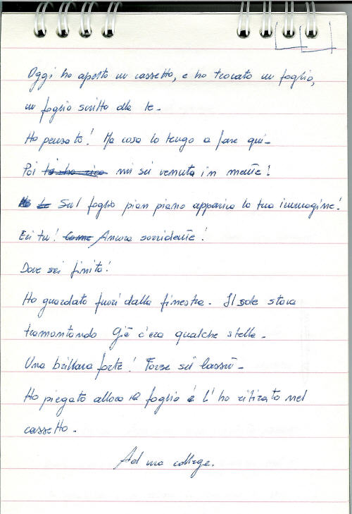 un foglio scritto da Te. Ho pensato ! Ma cosa lo tengo a fare qui. Poi mi sei venuta in mente ! Sul foglio pian piano appariva la tua immagine ! Eri tu ! Ancora sorridente ! Dove sei finita ! Ho guardato fuori dalla finestra. Il sole stava tramontando. Già c'era qualche stella. Una brillava forte ! Forse sei lassù. Ho piegato allora il foglio e l'ho ritirato nel cassetto. Ad una collega. |
